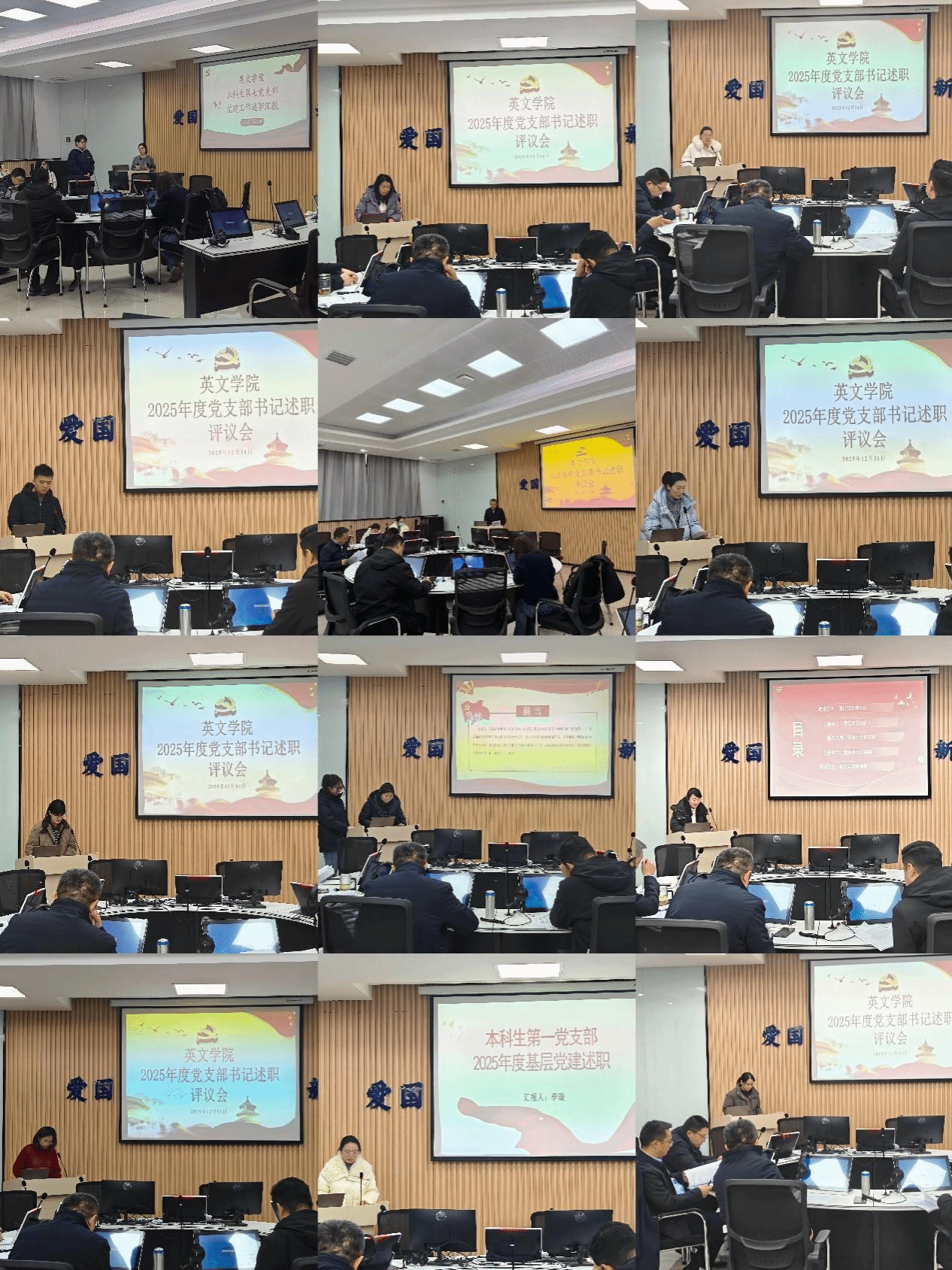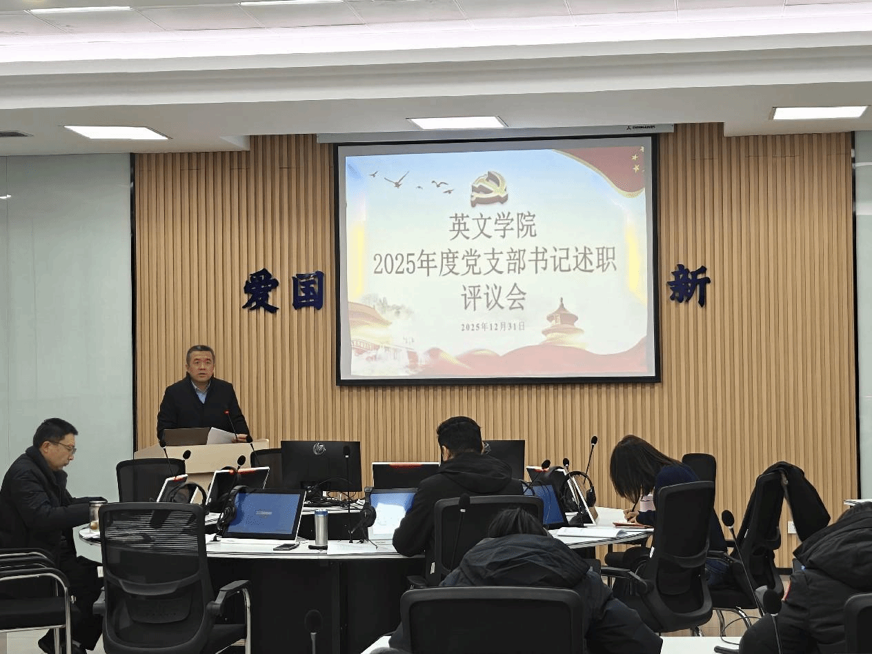 述职环节中,商务英语党支部、翻译系党支部、研究生第一至第四党支部及本科生第一、二、三、四、五、七、九党支部共 13 位党支部书记依次作现场述职。各位书记紧扣述职评议核心内容,聚焦深入学习贯彻党的创新理论、落实立德树人根本任务、服务 "国之大者"、锻造先锋队伍、履行第一责任人职责等重点方面,以 "述我" 为核心,实事求是总结了2025年度基层党建工作成效,深入查摆了支部工作在活动创新、品牌建设、党建与业务融合等方面存在的问题,详细阐述了上年度反馈问题整改情况,并结合支部特色明确了下一步工作思路与改进举措。其中,商务英语党支部聚焦专业特色,探索 "党建 + 专业竞赛"党建+学生实习 "的融合路径;研究生党支部围绕学术创新与人才培养,计划深化"党建+科研 "帮扶机制;本科生党支部则在理论学习双语化、品牌活动特色化等方面积极探索,展现了各支部立足实际、务实奋进的良好风貌。