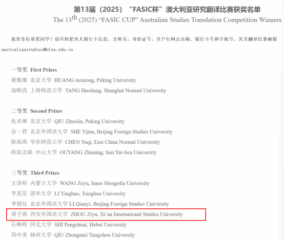 2025年10月19日,第13届(2025)“FASIC杯”全国澳大利亚研究翻译比赛获奖名单公布。我校澳大利亚研究中心指导的三位学生周子琪获三等奖、刘明星、蔡源获优秀奖。