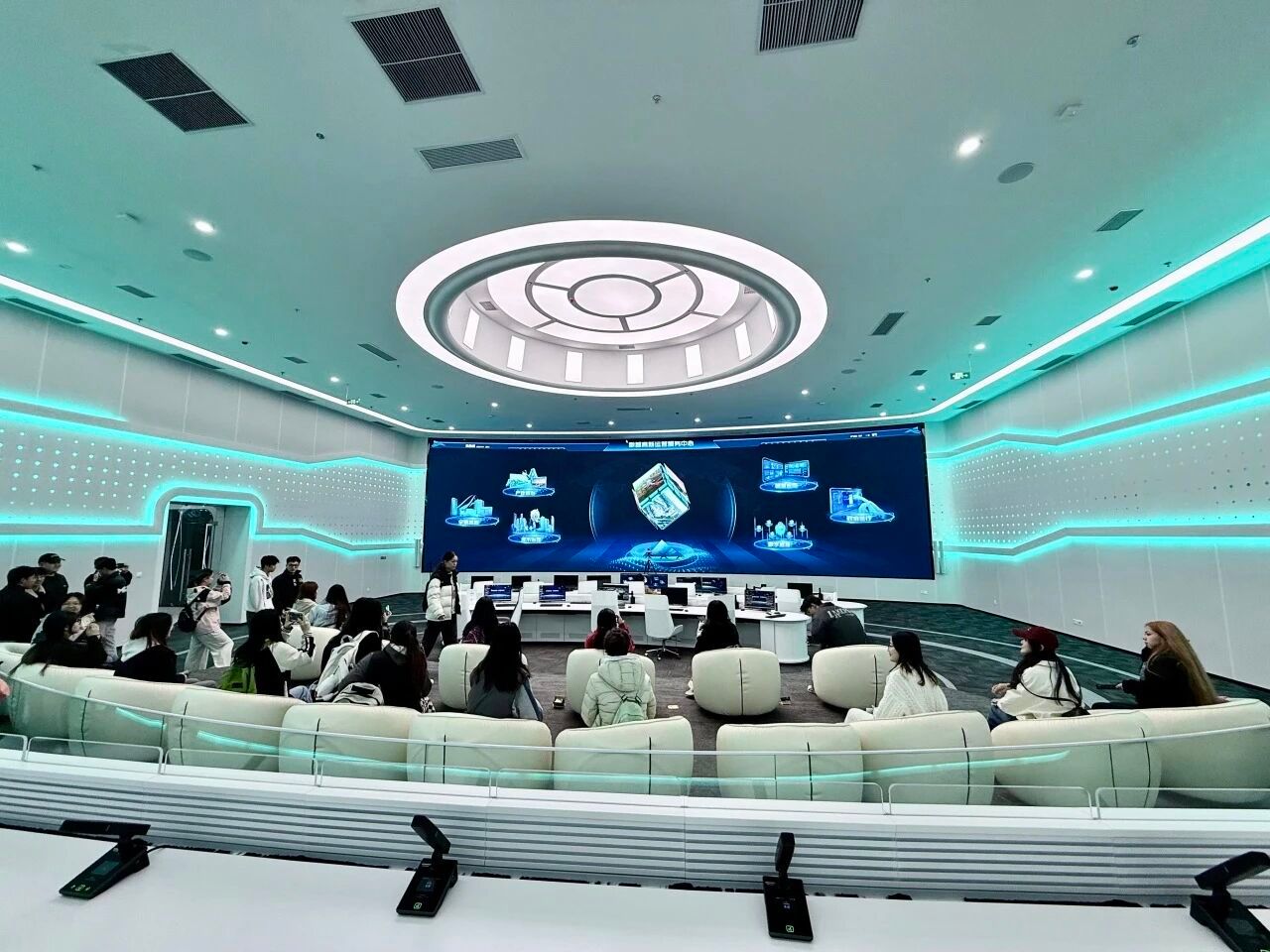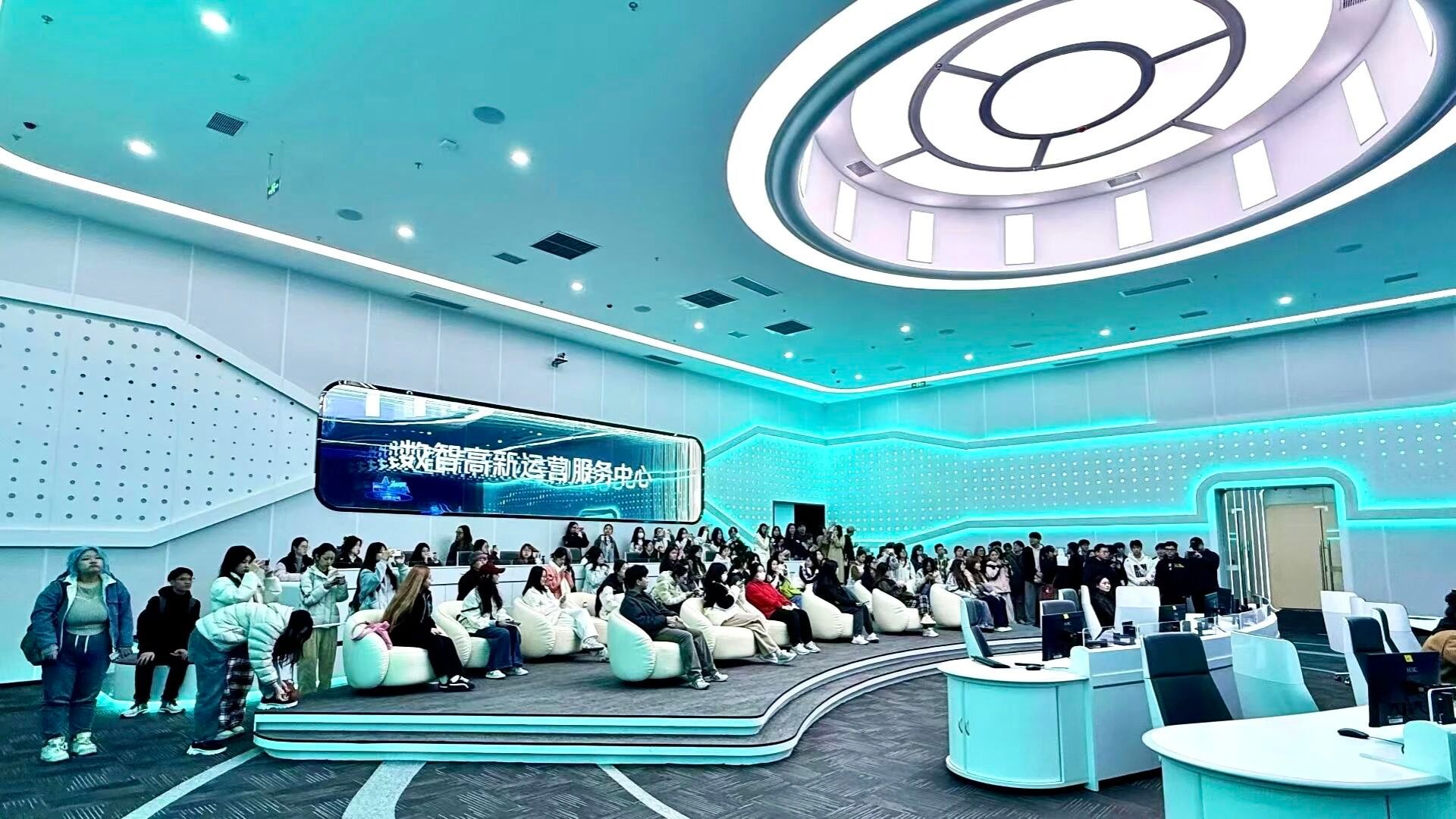 活动首站为咸阳高新区数字会客厅,该平台集中展示了数字技术在城市治理、产业升级中的应用成果。同学们在沉浸式展厅通过立体投影体验了璀璨“星河”等场景,感受穿越咸阳古今的“元宇宙”之旅;在数智高新运营服务中心学习全域感知、产业治理、城市治理、政府运行四大核心板块的运营机制,近距离接触高新区“智慧大脑”;在智算中心了解数字技术赋能城市治理、产业升级与经济运行的核心逻辑及“DeepSeek满血版大模型”的AI服务体系应用;在互动体验厅通过3D裸眼笔记本电脑、气味广告机等高科技产品感受智慧城市“一屏展示、一厅调度、一键指挥”的治理新范式。